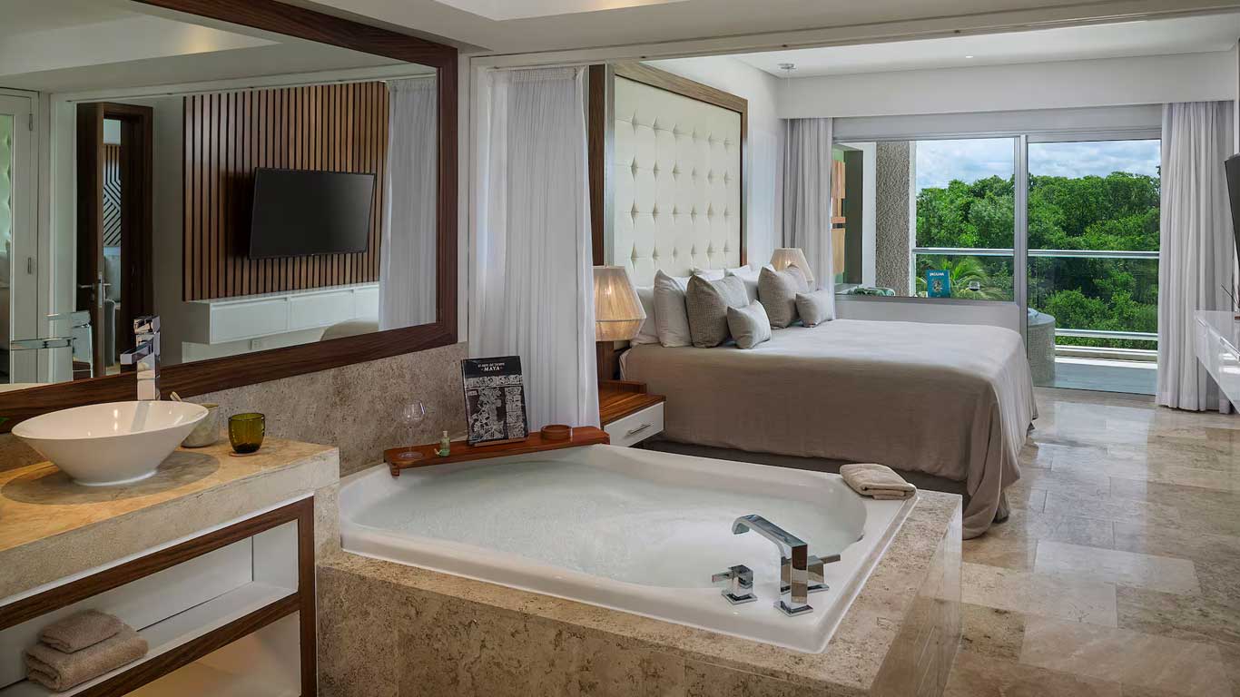 Listen to the sound of the waves from the terrace of the Master Suite with Nature Views at Paradisus La Perla. Ponder your days activities in a sensory bathtub where you can enjoy a peaceful, relaxing bath. A space comprising a bedroom and a living-dining room.