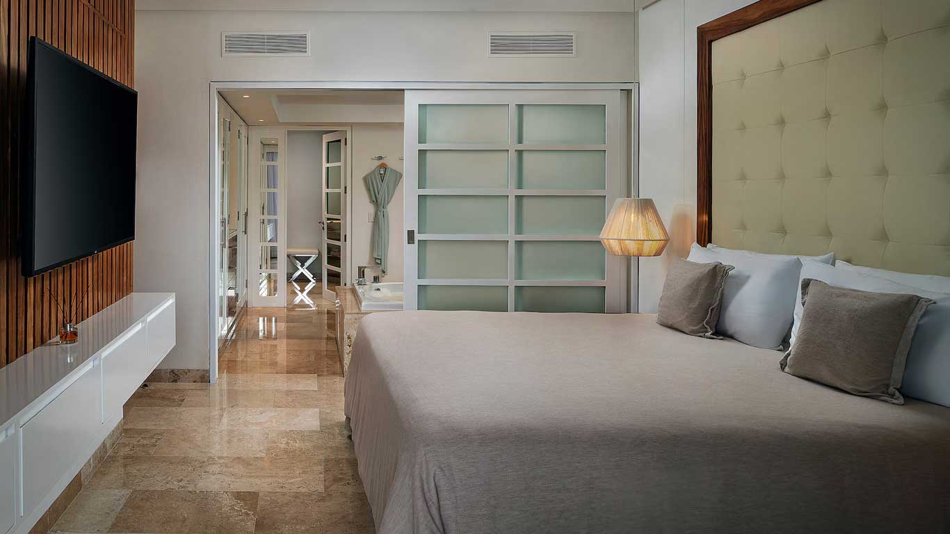 Listen to the sound of the waves from the terrace of the Master Suite with Nature Views at Paradisus La Perla. Ponder your days activities in a sensory bathtub where you can enjoy a peaceful, relaxing bath. A space comprising a bedroom and a living-dining room.