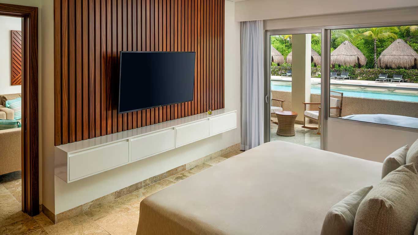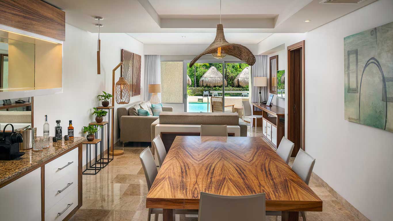 The Reserve Swim Up Master Suite at Paradisus La Perla offers access to a fantastic swimming pool from your terrace and all the privileges of The Reserve service. A suite with king-size bed, an elegant living room with dining area, and an extraordinary terrace with a whirlpool bathtub.