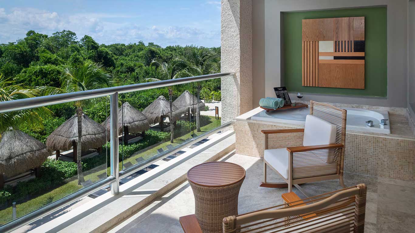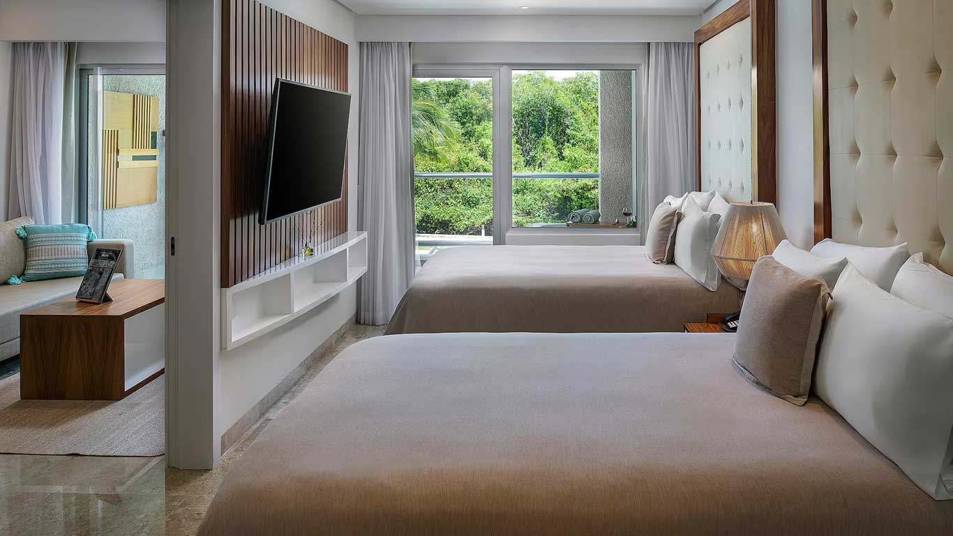 The Garden View Reserve Suite at Paradisus La Perla is a suite with two different spaces designed to guarantee a peaceful night’s rest. One bedroom and a comfortable living/dining room. In addition to a terrace with garden views and a hot tub.